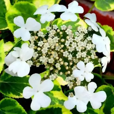 Это не просто гортензия — это украшение участка! Листья с жёлтой каймой светятся на солнце, а цветы — крупные, белые, как зонтики. Очень необычно и красиво.