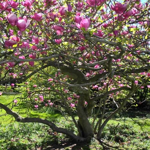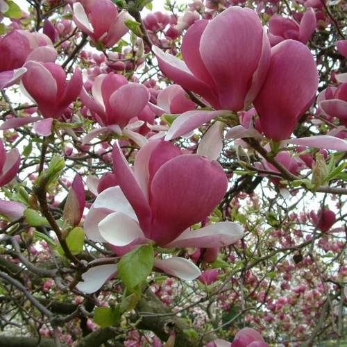Крупные ароматные цветки чашевидной или бокаловидной формы, внешне напоминают мелкие тюльпаны. Диаметр цветков до 20-25 см, окрашены в белые, розовые, красные (иногда двухцветные) тона. Цветение магнолии наступает очень рано, до появления листьев, в период, когда большинство садовых деревьев еще не цветет. Это время, чаще всего, — апрель или начало мая. Цветет магнолия, начиная с раннего возраста. Плоды созревают осенью.