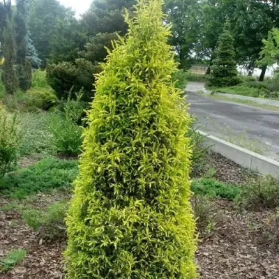 Хвоя Голд Кон трехгранная, игольчатая и колючая. Она имеет желтую окраску с золотисто-желтым оттенком, что придает растению особую красоту. В осенне-зимний период хвоя становится бронзовой, что создает дополнительную привлекательность.