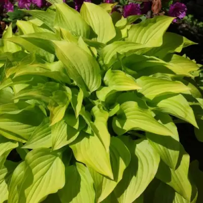Главное внимание приковывает листва. Широкие, сердцевидные пластины демонстрируют редкое для хост сочетание: насыщенно-зелёную кайму и золотисто-жёлтый центр. Весной оттенки особенно контрастны, летом слегка смягчаются, но сохраняют чёткое разграничение. Поверхность листа гладкая, с хорошо заметными прожилками и лёгкой волной по краям. Цвет держится стабильно до поздней осени, обеспечивая продолжительный декоративный эффект.