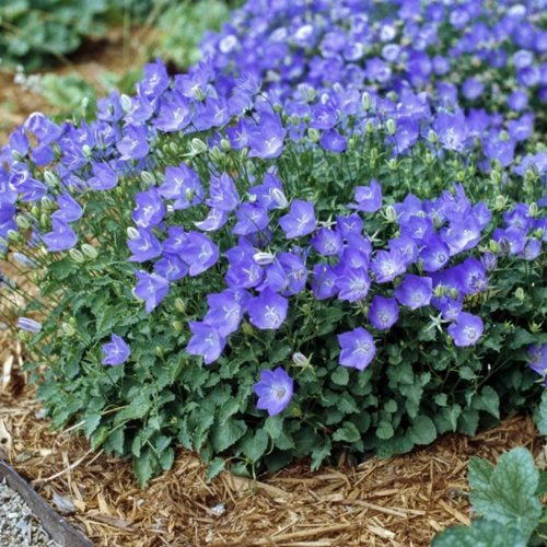 Цветки колокольчатые, широко раскрытые, синий оттенок глубокий, слегка холодный — визуально освежает композиции. Диаметр цветка 4–5 см. Цветки распускаются одиночно, но образуют плотную массу, полностью покрывая зелёную основу.