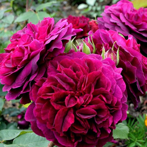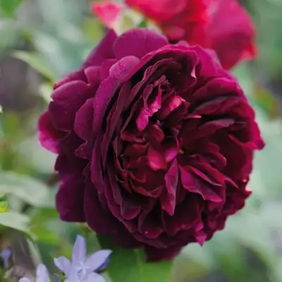 Цветки крупные — до 10 см в диаметре, густомахровые, чашевидные, с классической розеточной формой. Бутоны раскрываются медленно, сохраняя насыщенный винно-пурпурный цвет даже в условиях яркого солнца и повышенной влажности. Бархатистая текстура лепестков добавляет объем и глубину, а насыщенный аромат с фруктовыми нотами черной смородины и малины делает куст настоящим ароматическим центром сада.