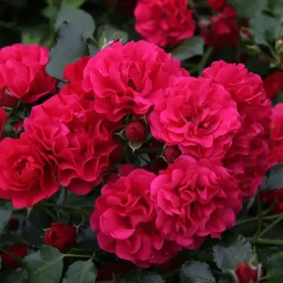 Цветение обильное, продолжительное: с начала июня и до поздней осени. Цветки мелкие (до 5 см), густомахровые, собраны в плотные соцветия. Окрас — насыщенно-красный, с глубоким малиновым подтоном. Даже при сильном солнце лепестки не выгорают. Цветы формируются в кистях по 5–15 штук, и благодаря самоочищающемуся типу лепестков куст всегда выглядит ухоженным. Аромат слабый, почти незаметный.