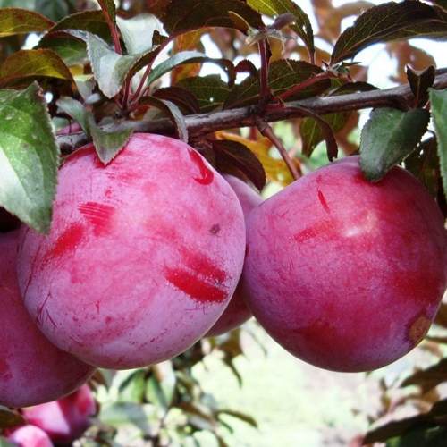 Листья растений ярко-красные, а цветы — розоватые и ароматные, что придаёт вашему саду особое очарование. Плоды сливы имеют крупный размер, весом около 30 граммов и округло-овальную форму. Их темно-пурпурный цвет почти достигает черного отлива, а под кожицей можно обнаружить множество серых точек, что делает их ещё более притягательными.