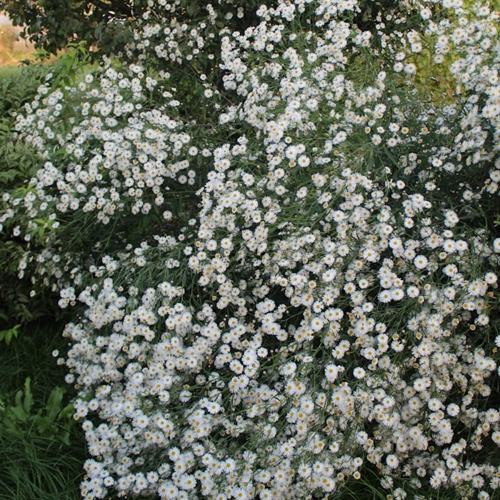 Цветение стартует в августе и продолжается до октября. Цветки мелкие (до 2,5 см), но за счёт количества создают эффект плотного соцветия. Белоснежные лепестки и жёлтая серединка напоминают мини-астры или ромашки. Оттенок цветов чистый, что особенно ценно в монохромных и контрастных посадках. Аромат отсутствует, что делает растение идеальным для участков рядом с террасами и зонами отдыха.