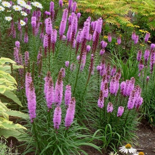 Розеа формирует стройный, компактный куст высотой 50–60 см и шириной до 30 см. Стебли прямые, прочные, не требуют подвязки. Крона плотная, но не громоздкая — лиатрис не разрастается вширь, а сохраняет вертикаль, что делает его идеальным для переднего и среднего плана миксбордеров. Растёт на одном месте без потери декоративности 4–5 лет.